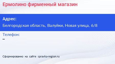 Ермолино, фирменный магазин по адресу Белгородская область, Валуйки, Новая улица, 6/8 в дальнейшем Организация, размещена в следующих категориях: