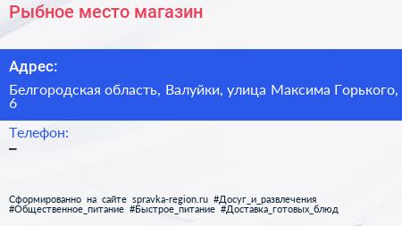 Рыбное место, магазин по адресу Белгородская область, Валуйки, улица Максима Горького, 6 в дальнейшем Организация, размещена в следующих категориях: