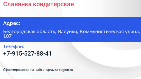 Славянка, кондитерская по адресу Белгородская область, Валуйки, Коммунистическая улица, 107 в дальнейшем Организация, размещена в следующих категориях: