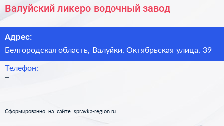 Валуйский ликеро-водочный завод по адресу Белгородская область, Валуйки, Октябрьская улица, 39 в дальнейшем Организация, размещена в следующих категориях:
