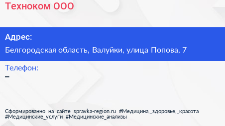 Техноком, ООО по адресу Белгородская область, Валуйки, улица Попова, 7 в дальнейшем Организация, размещена в следующих категориях: