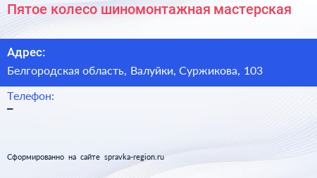 Пятое колесо, шиномонтажная мастерская по адресу Белгородская область, Валуйки, Суржикова, 103 в дальнейшем Организация, размещена в следующих категориях: