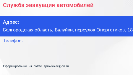 Служба эвакуация автомобилей по адресу Белгородская область, Валуйки, переулок Энергетиков, 18 в дальнейшем Организация, размещена в следующих категориях: