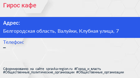 Гирос, кафе по адресу Белгородская область, Валуйки, Клубная улица, 7 в дальнейшем Организация, размещена в следующих категориях: