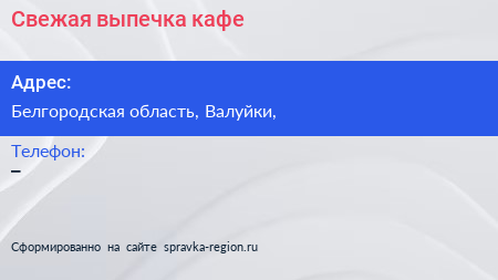 Свежая выпечка, кафе по адресу Белгородская область, Валуйки, в дальнейшем Организация, размещена в следующих категориях: