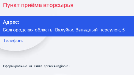 Пункт приёма вторсырья по адресу Белгородская область, Валуйки, Западный переулок, 5 в дальнейшем Организация, размещена в следующих категориях: