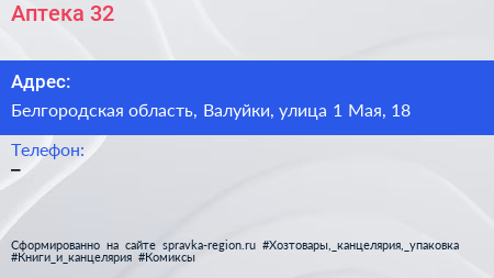 Аптека №32 по адресу Белгородская область, Валуйки, улица 1 Мая, 18 в дальнейшем Организация, размещена в следующих категориях: