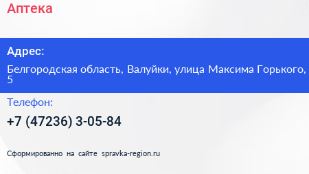 Аптека по адресу Белгородская область, Валуйки, улица Максима Горького, 5 в дальнейшем Организация, размещена в следующих категориях: