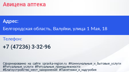 Авицена, аптека по адресу Белгородская область, Валуйки, улица 1 Мая, 18 в дальнейшем Организация, размещена в следующих категориях: