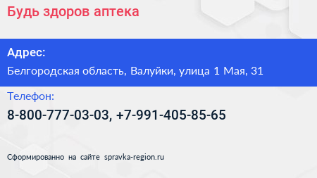 Будь здоров!, аптека по адресу Белгородская область, Валуйки, улица 1 Мая, 31 в дальнейшем Организация, размещена в следующих категориях: