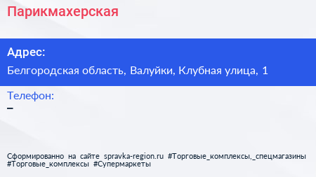 Парикмахерская по адресу Белгородская область, Валуйки, Клубная улица, 1 в дальнейшем Организация, размещена в следующих категориях: