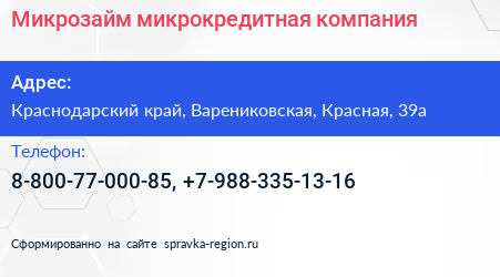 Микрозайм, микрокредитная компания по адресу Краснодарский край, Варениковская, Красная, 39а в дальнейшем Организация, размещена в следующих категориях: