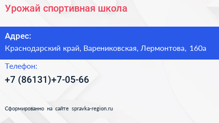 Урожай, спортивная школа по адресу Краснодарский край, Варениковская, Лермонтова, 160а в дальнейшем Организация, размещена в следующих категориях: