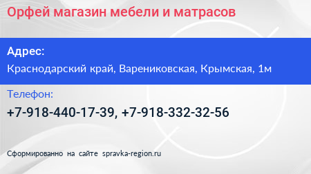 Орфей, магазин мебели и матрасов по адресу Краснодарский край, Варениковская, Крымская, 1м в дальнейшем Организация, размещена в следующих категориях: