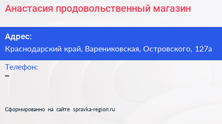 Анастасия, продовольственный магазин по адресу Краснодарский край, Варениковская, Островского, 127а в дальнейшем Организация, размещена в следующих категориях: