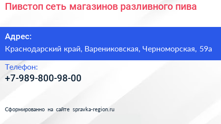 Пивстоп, сеть магазинов разливного пива по адресу Краснодарский край, Варениковская, Черноморская, 59а в дальнейшем Организация, размещена в следующих категориях: