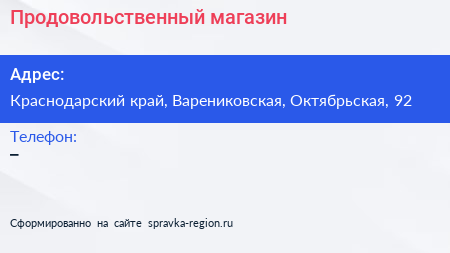 Продовольственный магазин по адресу Краснодарский край, Варениковская, Октябрьская, 92 в дальнейшем Организация, размещена в следующих категориях: