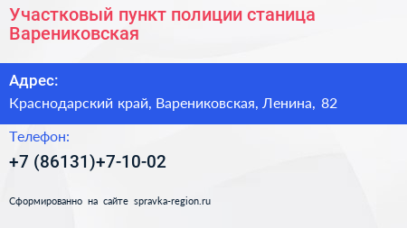 Участковый пункт полиции, станица Варениковская по адресу Краснодарский край, Варениковская, Ленина, 82 в дальнейшем Организация, размещена в следующих категориях: