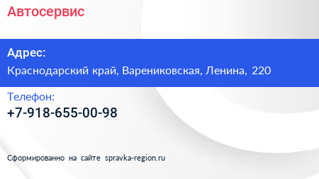 Автосервис по адресу Краснодарский край, Варениковская, Ленина, 220 в дальнейшем Организация, размещена в следующих категориях: