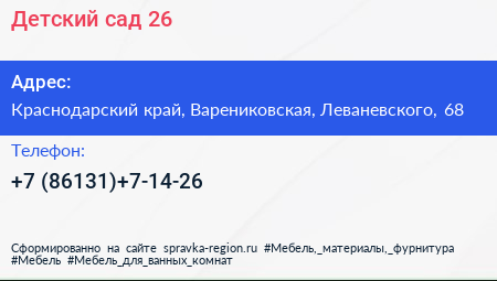 Детский сад №26 по адресу Краснодарский край, Варениковская, Леваневского, 68 в дальнейшем Организация, размещена в следующих категориях: