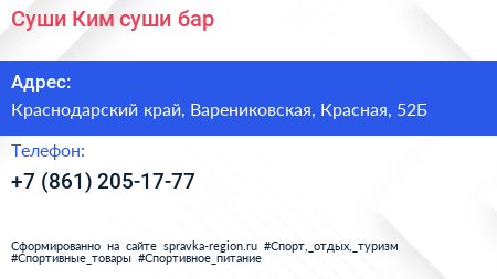 Суши Ким, суши-бар по адресу Краснодарский край, Варениковская, Красная, 52Б в дальнейшем Организация, размещена в следующих категориях: