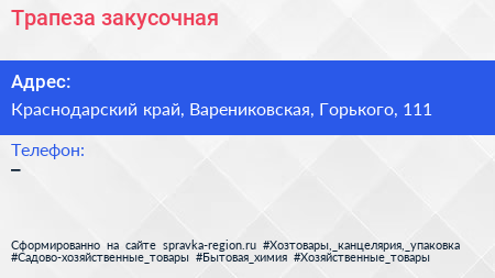 Трапеза, закусочная по адресу Краснодарский край, Варениковская, Горького, 111 в дальнейшем Организация, размещена в следующих категориях: