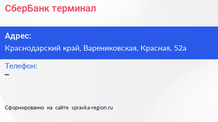 СберБанк, терминал по адресу Краснодарский край, Варениковская, Красная, 52а в дальнейшем Организация, размещена в следующих категориях: