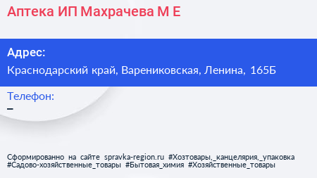 Аптека, ИП Махрачева М.Е. по адресу Краснодарский край, Варениковская, Ленина, 165Б в дальнейшем Организация, размещена в следующих категориях: