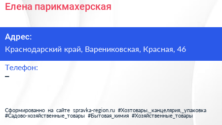 Елена, парикмахерская по адресу Краснодарский край, Варениковская, Красная, 46 в дальнейшем Организация, размещена в следующих категориях: