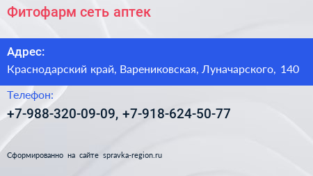 Фитофарм, сеть аптек по адресу Краснодарский край, Варениковская, Луначарского, 140 в дальнейшем Организация, размещена в следующих категориях: