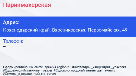 Парикмахерская по адресу Краснодарский край, Варениковская, Первомайская, 49 в дальнейшем Организация, размещена в следующих категориях: