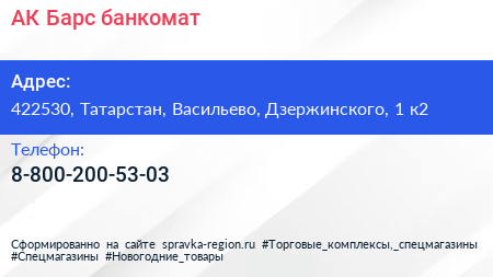 АК Барс, банкомат по адресу 422530, Татарстан, Васильево, Дзержинского, 1 к2 в дальнейшем Организация, размещена в следующих категориях: