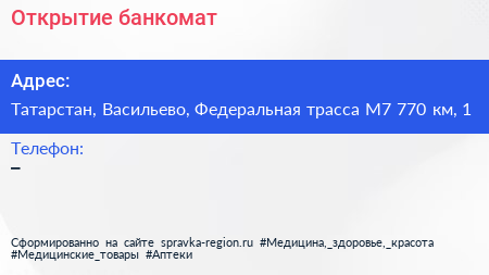 Открытие, банкомат по адресу Татарстан, Васильево, Федеральная трасса М7 770 км, 1 в дальнейшем Организация, размещена в следующих категориях: