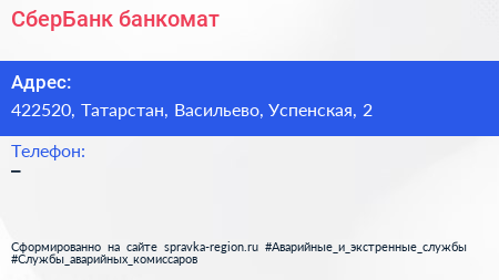 СберБанк, банкомат по адресу 422520, Татарстан, Васильево, Успенская, 2 в дальнейшем Организация, размещена в следующих категориях: