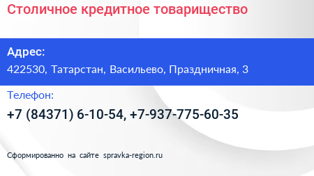 Столичное кредитное товарищество по адресу 422530, Татарстан, Васильево, Праздничная, 3 в дальнейшем Организация, размещена в следующих категориях: