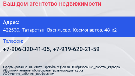 Ваш дом, агентство недвижимости по адресу 422530, Татарстан, Васильево, Космонавтов, 48 к2 в дальнейшем Организация, размещена в следующих категориях: