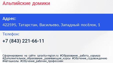 Альпийские домики по адресу 422595, Татарстан, Васильево, Западный посёлок, 1 в дальнейшем Организация, размещена в следующих категориях: