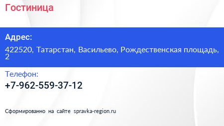Гостиница по адресу 422520, Татарстан, Васильево, Рождественская площадь, 2 в дальнейшем Организация, размещена в следующих категориях: