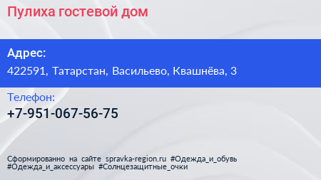 Пулиха, гостевой дом по адресу 422591, Татарстан, Васильево, Квашнёва, 3 в дальнейшем Организация, размещена в следующих категориях: