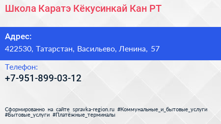 Школа Каратэ Кёкусинкай-Кан РТ по адресу 422530, Татарстан, Васильево, Ленина, 57 в дальнейшем Организация, размещена в следующих категориях: