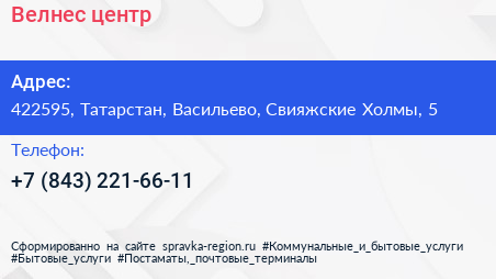 Велнес-центр по адресу 422595, Татарстан, Васильево, Свияжские Холмы, 5 в дальнейшем Организация, размещена в следующих категориях: