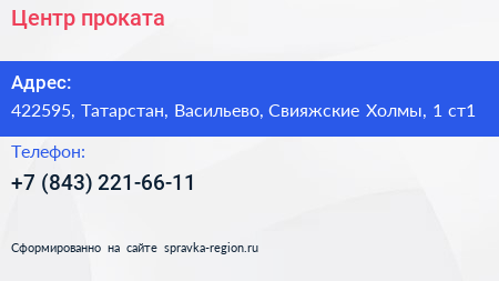 Центр проката по адресу 422595, Татарстан, Васильево, Свияжские Холмы, 1 ст1 в дальнейшем Организация, размещена в следующих категориях: