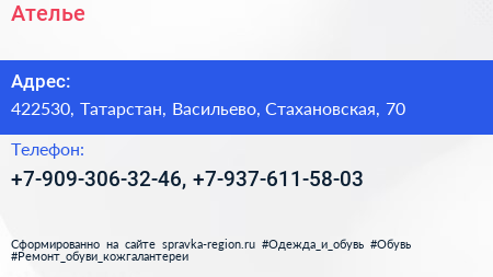 Ателье по адресу 422530, Татарстан, Васильево, Стахановская, 70 в дальнейшем Организация, размещена в следующих категориях: