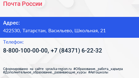Почта России по адресу 422530, Татарстан, Васильево, Школьная, 21 в дальнейшем Организация, размещена в следующих категориях: