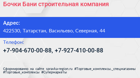 Бочки-Бани, строительная компания по адресу 422530, Татарстан, Васильево, Северная, 44 в дальнейшем Организация, размещена в следующих категориях: