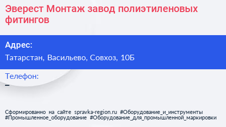 Эверест Монтаж, завод полиэтиленовых фитингов по адресу Татарстан, Васильево, Совхоз, 10Б в дальнейшем Организация, размещена в следующих категориях: