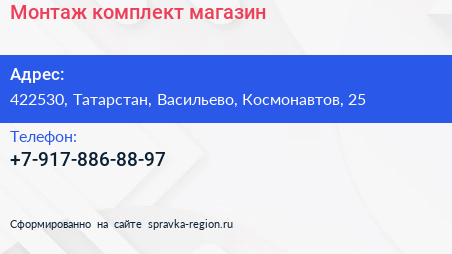Монтаж-комплект, магазин по адресу 422530, Татарстан, Васильево, Космонавтов, 25 в дальнейшем Организация, размещена в следующих категориях: