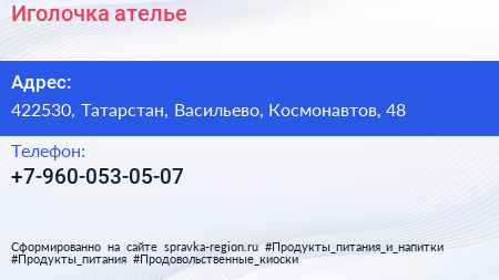 Иголочка, ателье по адресу 422530, Татарстан, Васильево, Космонавтов, 48 в дальнейшем Организация, размещена в следующих категориях:
