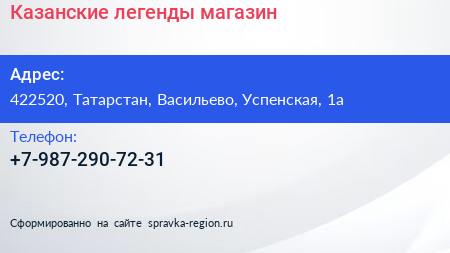 Казанские легенды, магазин по адресу 422520, Татарстан, Васильево, Успенская, 1а в дальнейшем Организация, размещена в следующих категориях: