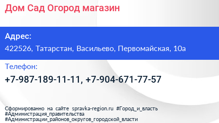 Дом-Сад-Огород, магазин по адресу 422526, Татарстан, Васильево, Первомайская, 10а в дальнейшем Организация, размещена в следующих категориях: